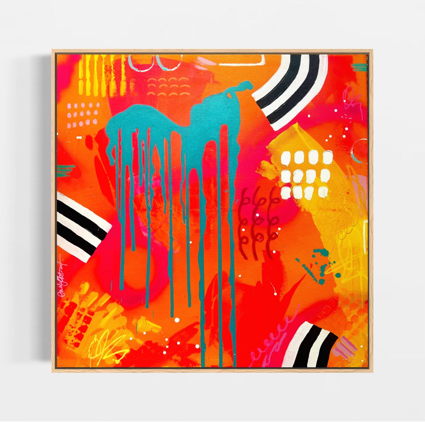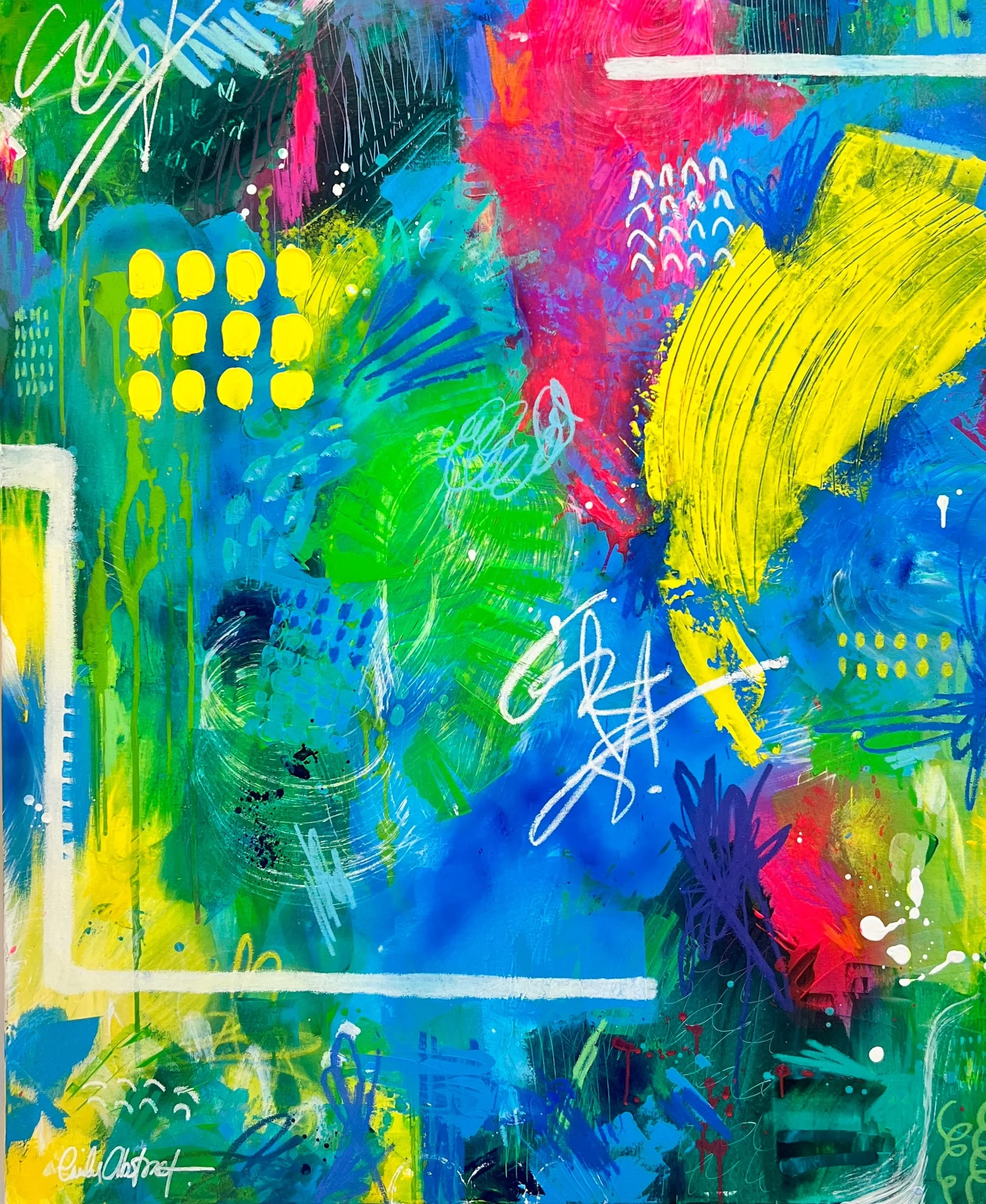 Electric Jungle is a vibrant original abstract painting designed to energise a space and lift your mood instantly. Saturated layers of electric blue, acid green and neon yellow collide with flashes of hot pink and bold white marks, creating a spontaneous, playful composition full of life.