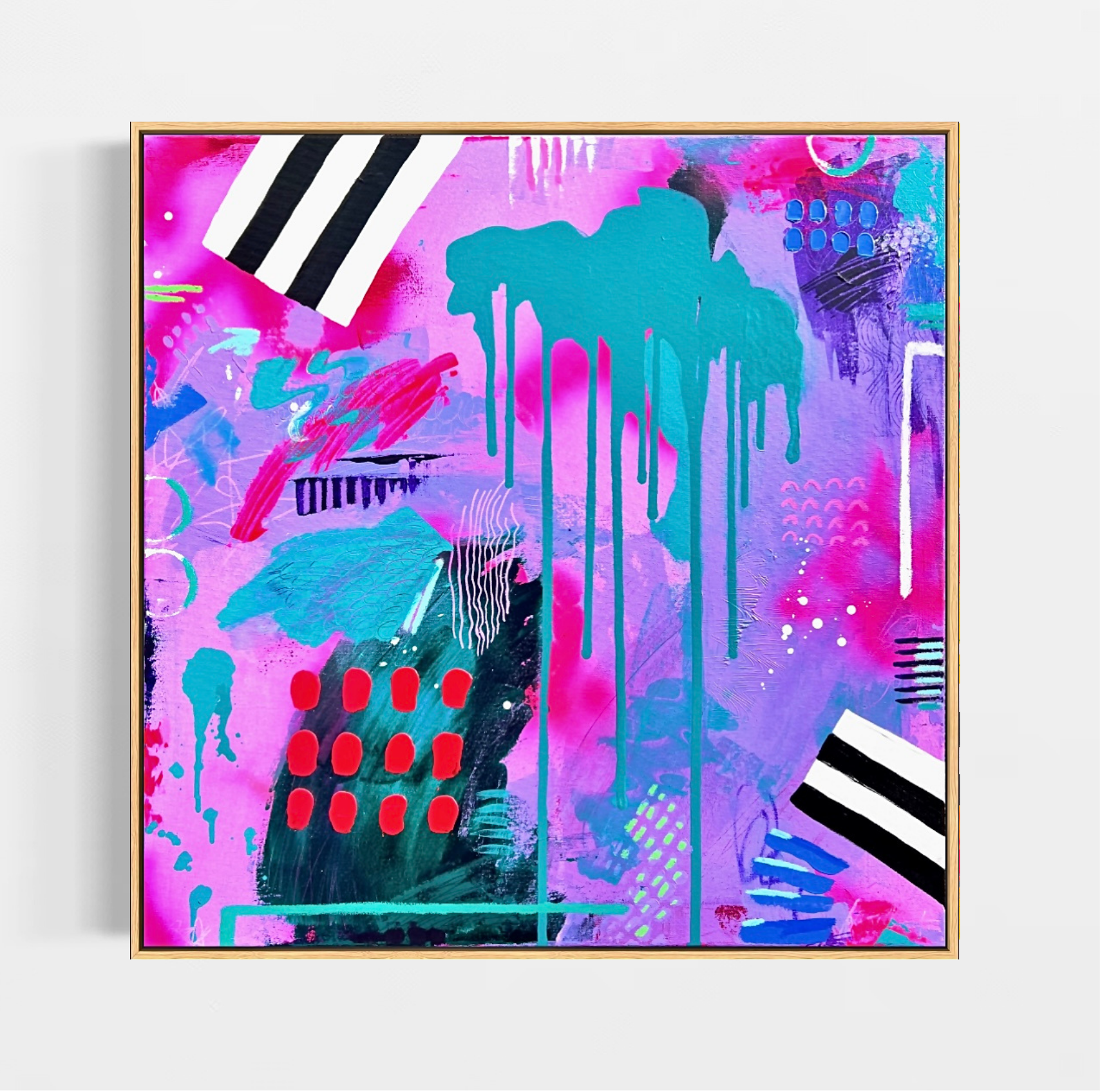 Turn Up The Heat is a bold large abstract painting bursting with vibrant colour, movement and expressive energy. Radiant oranges, hot pinks and flashes of yellow create a glowing backdrop, while turquoise drips cut through the surface with fluid intensity.