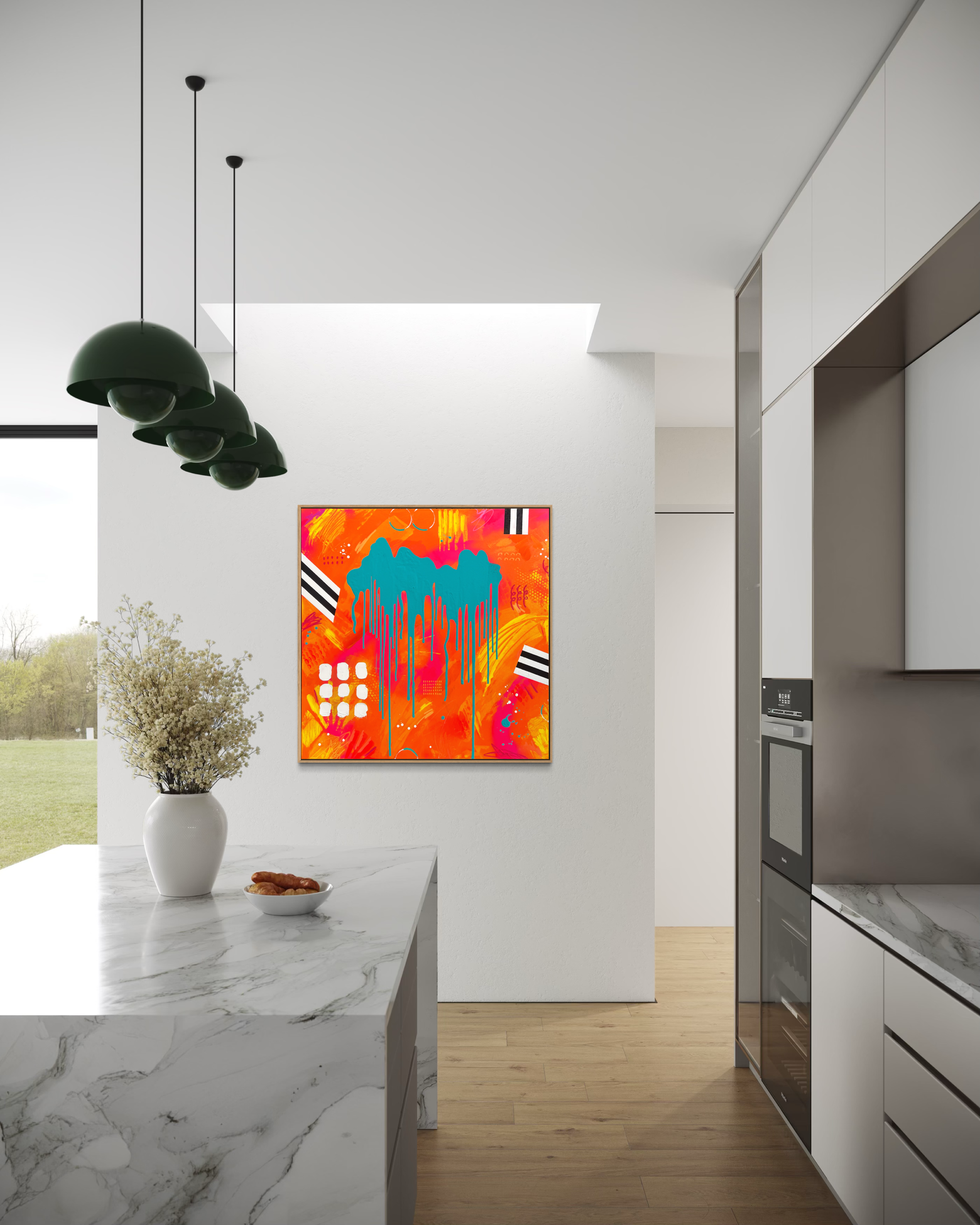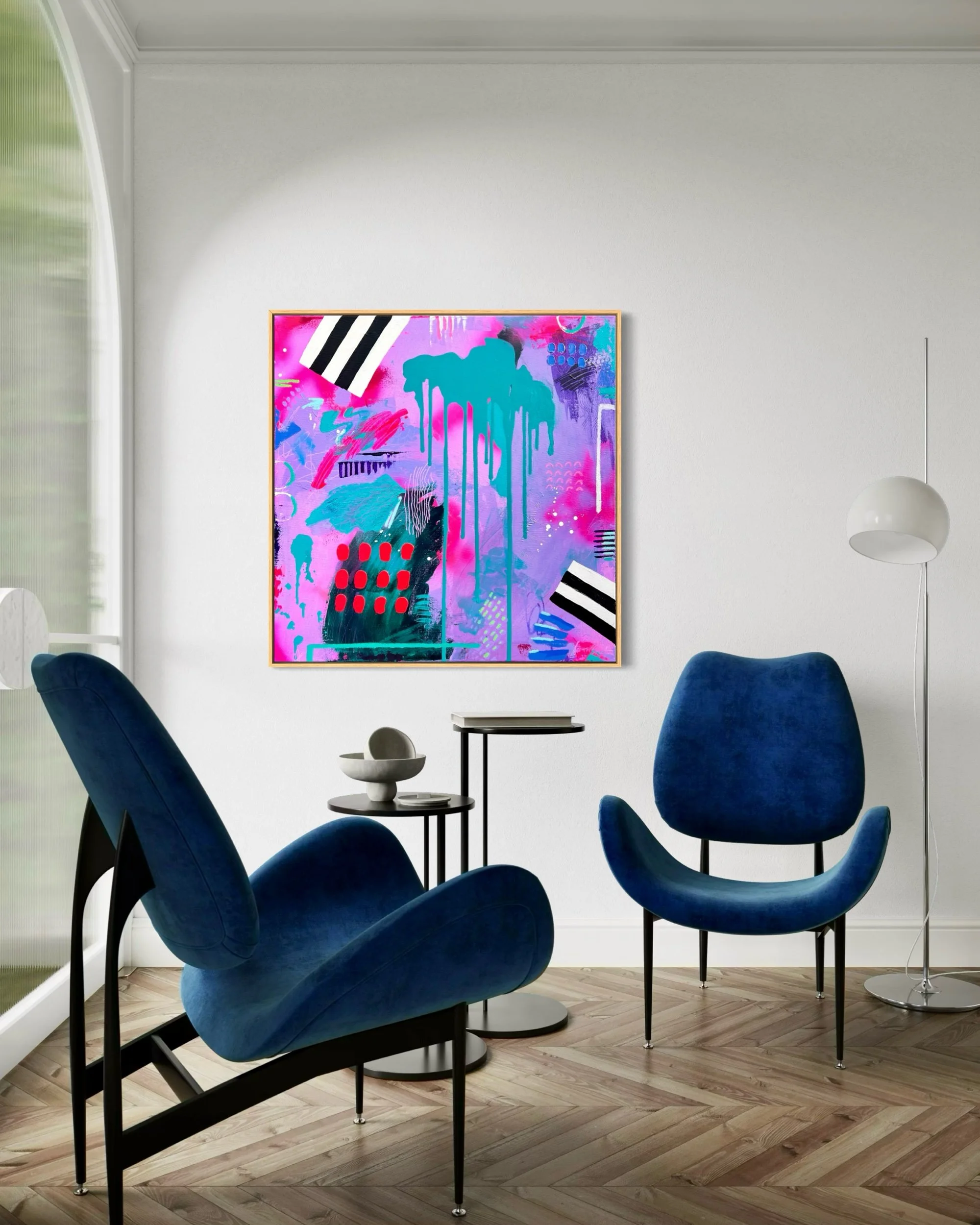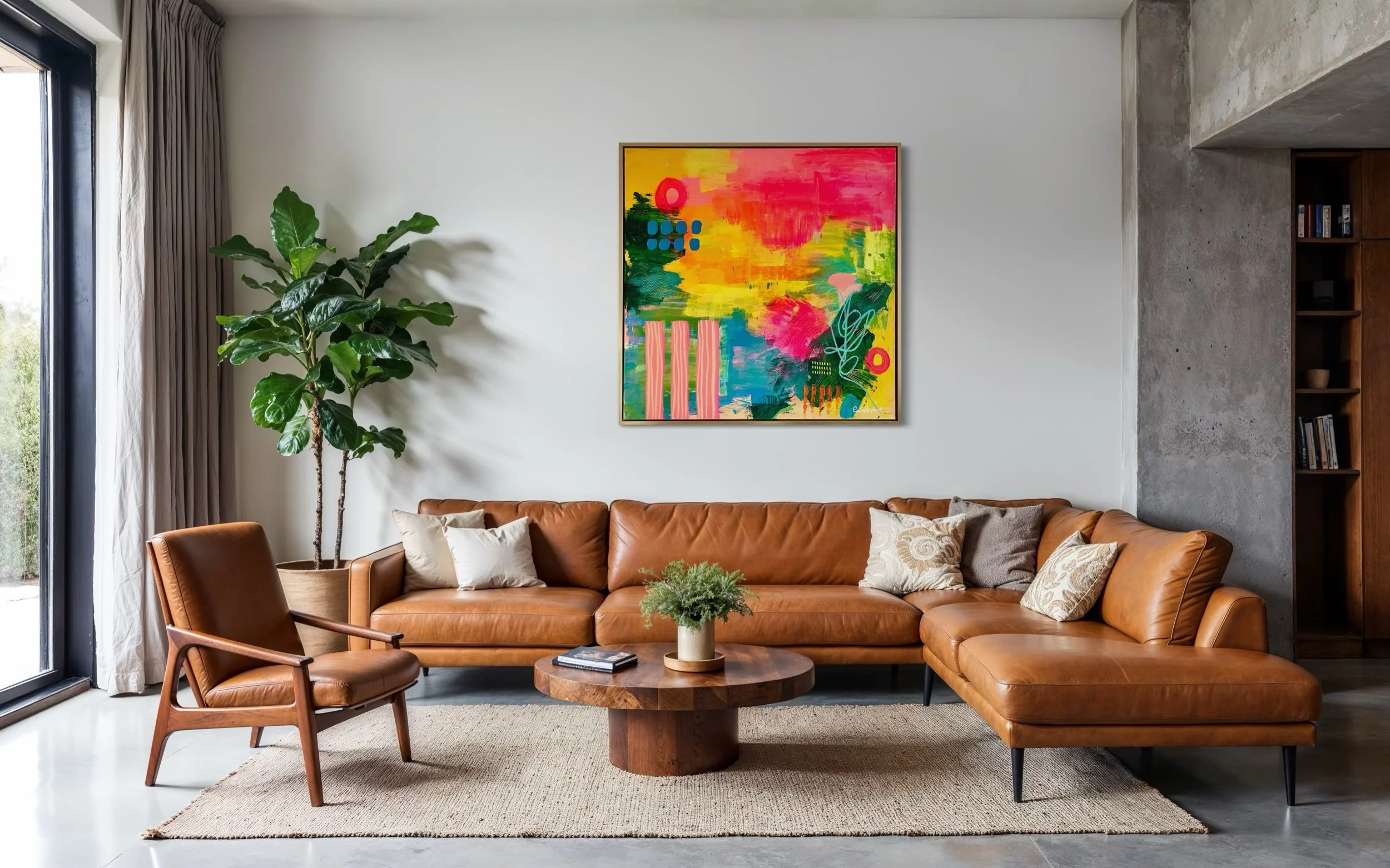 Designed as a powerful statement piece for modern interiors, this colourful contemporary abstract artwork brings warmth, movement and unapologetic joy into any space.